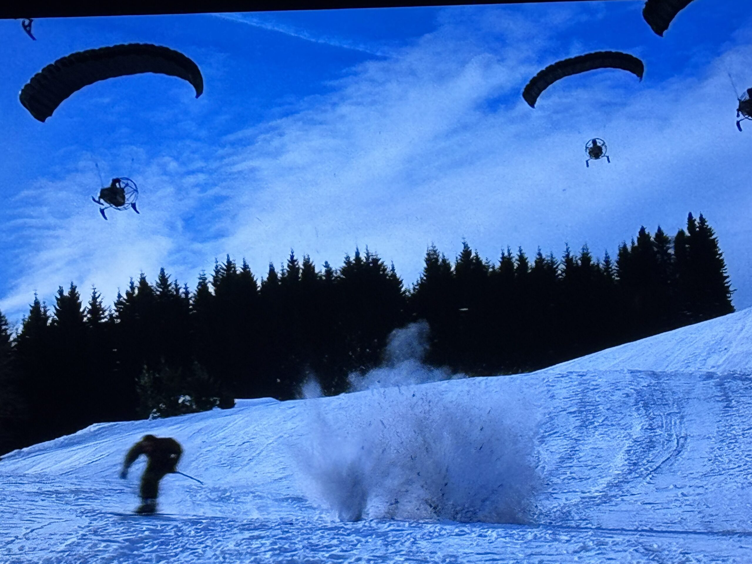 A paraglider snow showdown with Bond on skis.