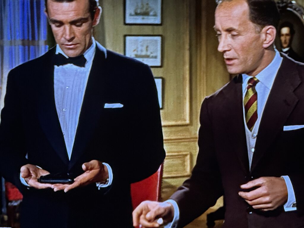 The film series has yet to introduce Q. Instead we get a mission briefing scene where armorer “Boothroyd” provides 007 with his signature Walther PPK (replacing his heavier Beretta).
