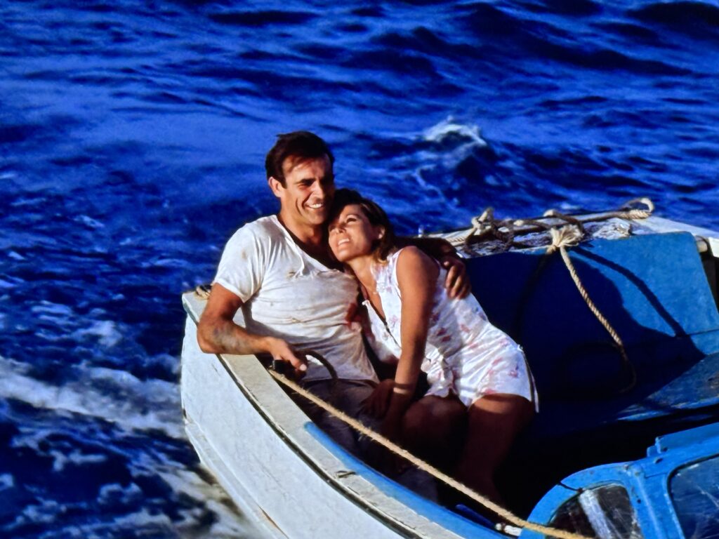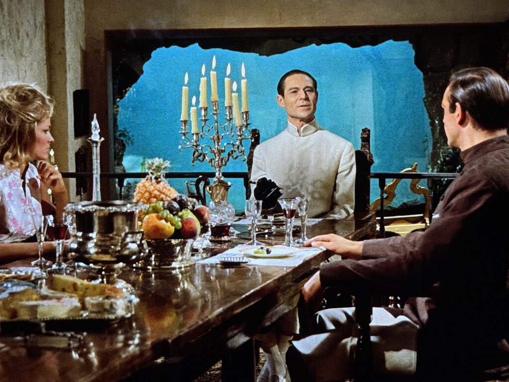 Set almost entirely on location in Jamaica, the film does a terrific job incorporating the tropical paradise in immersive ways. We don’t just get confined to the beach, viewers are able to escape to mid-century Jamaica, from Kingston to “Crab Key.” That forbidden key is where we find our series first villain lair, and boy does it set the template. We’ve been invited to dinner with Dr. No and his one million dollar aquarium. We’ve got a hotel alongside crew quarters and a reactor room equipped with a laser/radio beam (because of course we do). Mostly filmed on a sound stage at Pinewood, the interior of Dr. No’s lair still remains one of the most iconic locations apart from Blofeld’s volcano base in You Only Live Twice. For its iconic settings, and escapist portrayal of the Caribbean, this portion of the category gets a perfect 10/10.