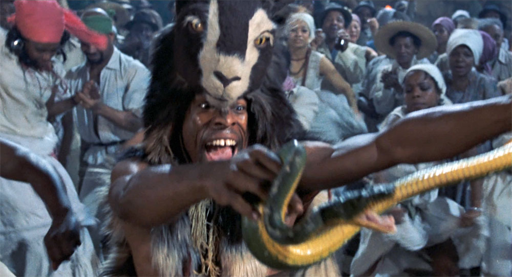 Beyond our gritty urban landscape, we also travel back to Jamaica only ten years after Dr. No. Of course Jamaica is actually a stand-in for the fictional island nation of San Monique. Voodoo as a theme is well established throughout the film, from little voodoo scarecrows with cameras and gun-barrels, to various totems and artifacts like the small hat with a feather, motifs are everywhere. Whether on the island in Baron Samedi’s graveyard or in the oh-cult voodoo shop in Harlem getting your stuffed snake wrapped length-wise, voodoo is an establishing representation of setting. It’s what contributes to the feeling of the film, and adds a supernatural element unusual for Bond films.