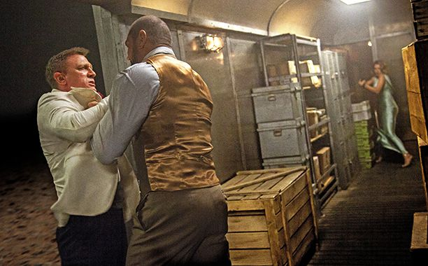In a setting straight out of From Russia with Love, Bond joins Madeleine on a train ride to our master villain’s lair. He learns she is far more adept with a gun than we would have realized, and we gain important backstory from Madeleine, that a man was sent to kill her father as a child (a storyline which will be further explored in No Time to Die). The tender back and forth between Bond and Madeleine in the dining car is clearly meant to call back to Bond and Vesper, but the chemistry is a bit lacking here (more on that later). Before they can continue to speed-date, Mr. Hinx crashes the party, literally. What ensues is a memorable and physical fight in a call back to Bond vs. Red Grant in FRWL. Madeleine helps Bond, who in the end uses some creative 007 thinking to tie Hinx to barrels that are then ripped from the caboose with him in tow. And off to bed our two lovers go.