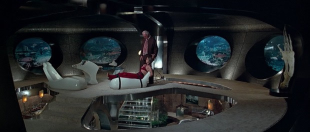 The settings of The Spy Who Loved Me are extremely well utilized and memorable, most notably the villain lair of Atlantis in the middle of the sea, which is villain Stromberg’s research facility. it is among the most elaborate designs ever accomplished by Ken Adam. It’s a spaceship like exterior with a palatial interior fully equipped with panoramic ocean or sea/marine life views (depending on whether it’s submerged or not). It of course has a shark tank trap too. It’s as if Dr. No’s base were set at sea.